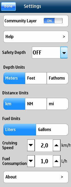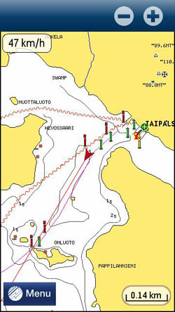 Hieman lisää asiaa tutkineena löysinkin kännykässäni (Nokia N8) toimivan Navionicsin toteuttaman merikartta sovelluksen. Epäilleenä aloin tutkimaan asiaa ja 10 euron kertamaksullisena hinta ei todellakaan ole korkea edes testaukseen.