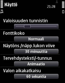 Ikävä kyllä N8:ssa näytönsäästäjän tai näppäinlukon aikaa ei voi säätää yli 30 minuutin ja valon aikakatkaisunkin saa maksimissaan 60 sekunniksi joka tämän sovelluksen käytössä on kyllä liian alhainen.